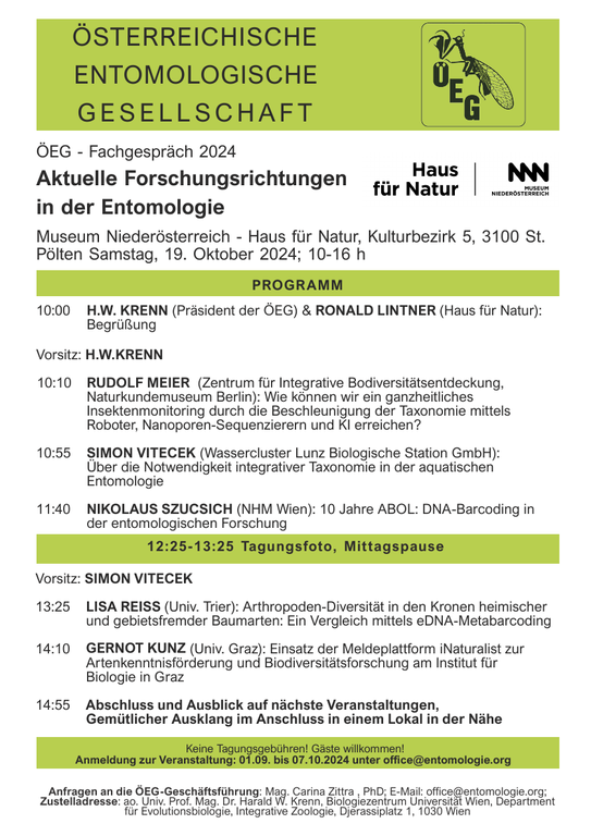 Voranmeldung zur Veranstaltung inklusive Angabe ob am gemütlichen Ausklang im Anschluss an die Veranstaltung in einem Lokal in der Nähe teilgenommen wird ist ab dem 01.09.2024 bei Carina Zittra (office@entomologie.org) möglich. Gäste sind herzlich willkommen!Programm_ÖEG_Fachgespaech2024_Aktuelle Forschungsrichtungen in der Entomologie.pdf760 KB